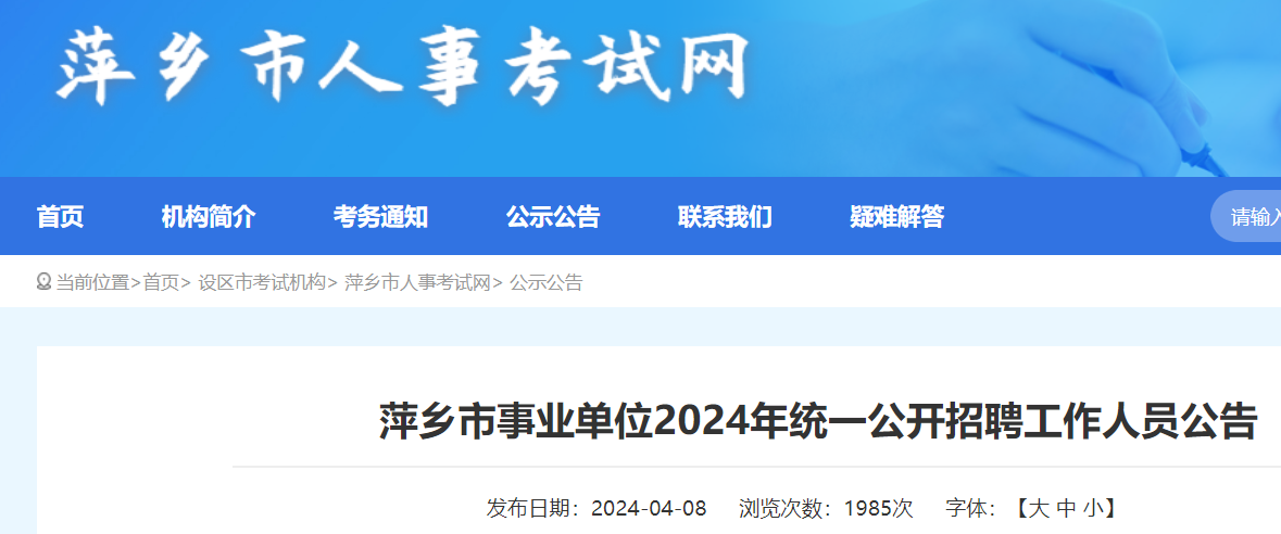 根據(jù)事業(yè)單位公開(kāi)招聘有關(guān)規(guī)定,現(xiàn)將萍鄉(xiāng)市事業(yè)單位2024年統(tǒng)一公開(kāi)招聘工作人員有關(guān)事項(xiàng)公告如下: