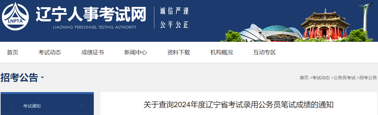 2024年度遼寧省考試錄用公務(wù)員筆試閱卷工作已經(jīng)結(jié)束,從即日起,考生可通過遼寧人事考試網(wǎng)(www.lnrsks.com,下同)查詢筆試成績。