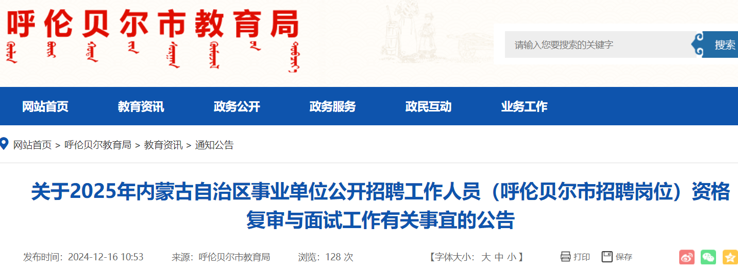 小編根據(jù)呼倫貝爾市教育局發(fā)布“關(guān)于2025年內(nèi)蒙古自治區(qū)事業(yè)單位公開招聘工作人員(呼倫貝爾市招聘崗位)資格復(fù)審與面試工作有關(guān)事宜的公告”得知,2025年內(nèi)蒙古自治區(qū)事業(yè)單位公開招聘工作人員資格審核時間為2024年12月19日至12月21日,詳情如下: