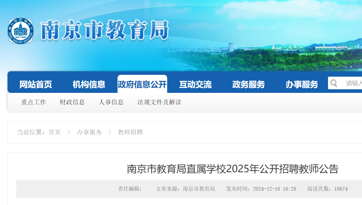 2025年江蘇南京市教育局直屬學校公開招聘教師公告已發(fā)布,報名、材料及照片上傳時間:2024年12月21日8:00至12月25日16:00?,F(xiàn)將招聘公告原文發(fā)布如下: