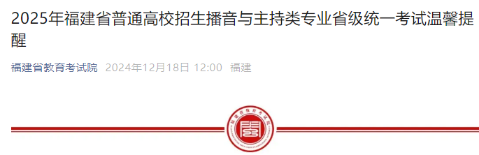 從福建省教育考試院了解到,2025年福建普通高校招生播音與主持類專業(yè)省級考試提醒已公布,考試時間:2024年12月25日開始。具體如下: