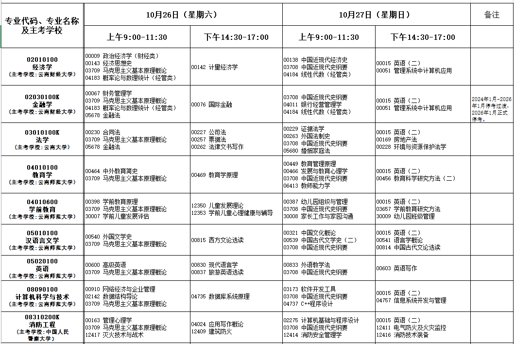 考試時(shí)間為2024年10月26—27日,上午9:00—11:30,下午14:30—17:00(具體開(kāi)考專業(yè)及課程考試安排、使用教材、課程設(shè)置與學(xué)分詳見(jiàn)附件1、2、3)。