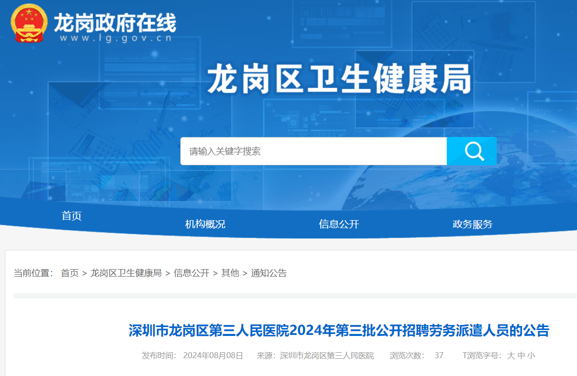 2024年廣東深圳市龍崗區(qū)第三人民醫(yī)院第三批公開招聘勞務(wù)派遣人員公告已發(fā)布,報(bào)名時(shí)間:自公告發(fā)布之日起至崗位招滿人員為止?,F(xiàn)將招聘公告原文發(fā)布如下: