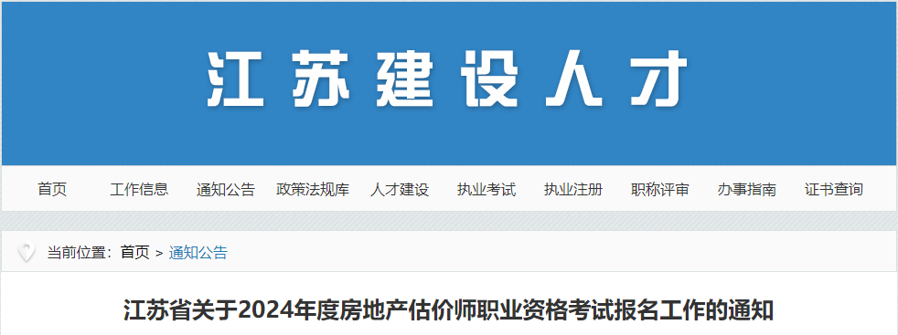 從江蘇建設人才獲悉,《2024年江蘇房地產(chǎn)估價師職業(yè)資格考試工作通知》現(xiàn)已公布,報名時間:8月12日-30日,考試時間:11月9日-10日,更多事宜請參考閱讀《考務通知》,官方公告原文如下: