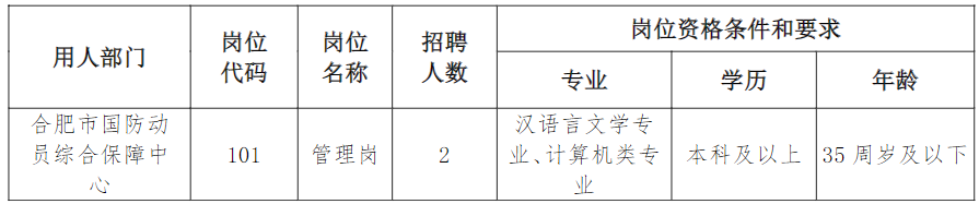 因工作發(fā)展需要,合肥市國防動員辦公室所屬事業(yè)單位公開招聘編外使用工作人員2人,現(xiàn)就有關(guān)