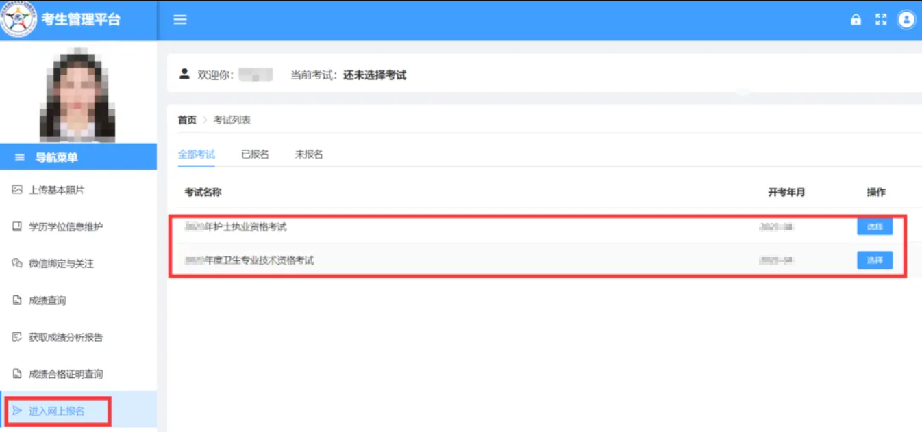 登錄考生管理平臺(tái)后,點(diǎn)擊左側(cè)導(dǎo)航欄“進(jìn)入網(wǎng)上報(bào)名”,在“已報(bào)名”考試列表中選擇考試項(xiàng)目。