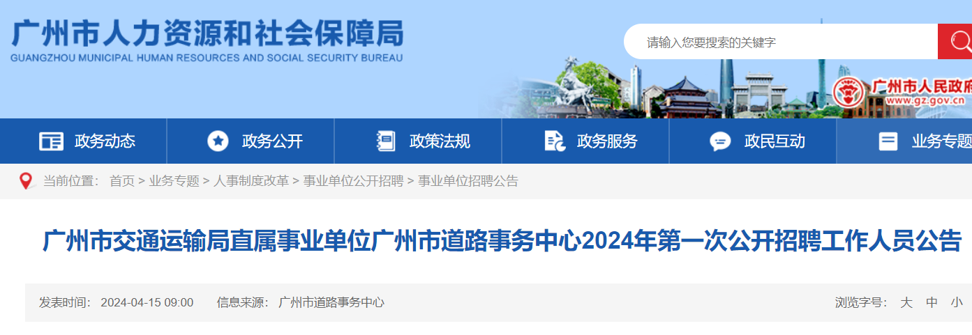 廣州市道路事務(wù)中心是市交通運輸局直屬公益一類事業(yè)單位,正處級。本次公開招聘事業(yè)編制工作人員15名,招聘崗位、專業(yè)和具體要求詳見《廣州市交通運輸局直屬事業(yè)單位廣州市道路事務(wù)中心2024年第公開招聘崗位需求表》(附件1)。