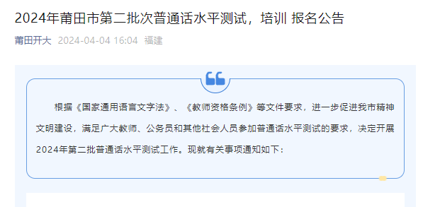 從莆田開大獲悉,2024年第二批次福建莆田普通話報名入口已開通,考試時間為4月27日、5月4日、5月5日,具體詳情如下: