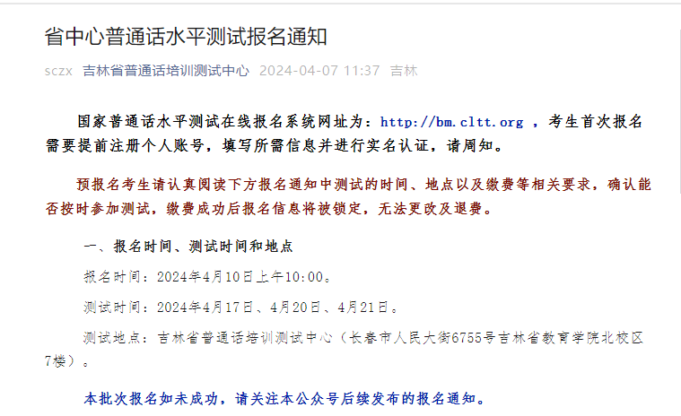 從吉林省普通話培訓測試中心獲悉,吉林省普通話培訓測試中心2024年4月普通話考試時間為4月17、20、21日,報名時間為4月10日起,具體詳情如下: