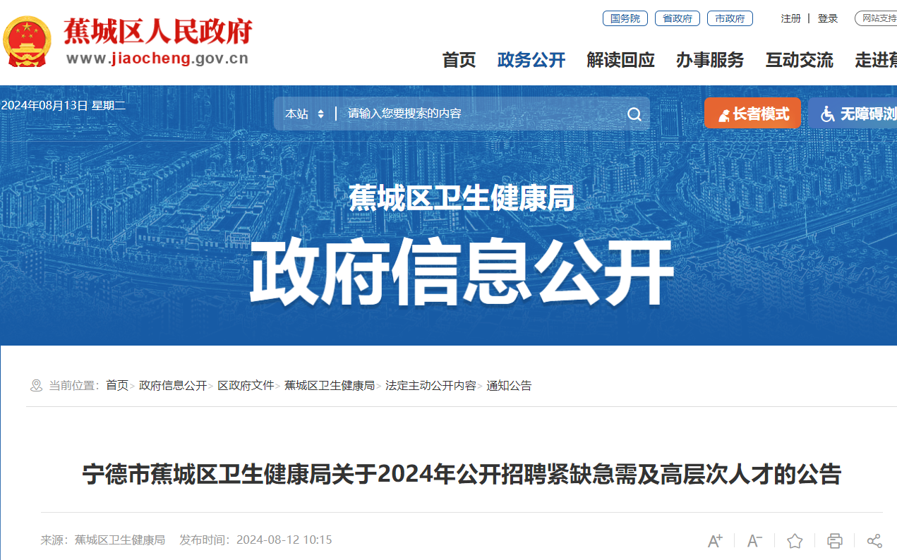 2024福建寧德蕉城區(qū)衛(wèi)生健康局招聘緊缺急需及高層次人才公告已發(fā)布,報名時間:2024年8月27日至2024年8月31日。現(xiàn)將招聘公告原文發(fā)布如下: