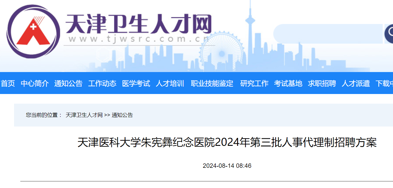 天津醫(yī)科大學(xué)朱憲彝紀(jì)念醫(yī)院2024年第三批人事代理崗位招聘計(jì)劃