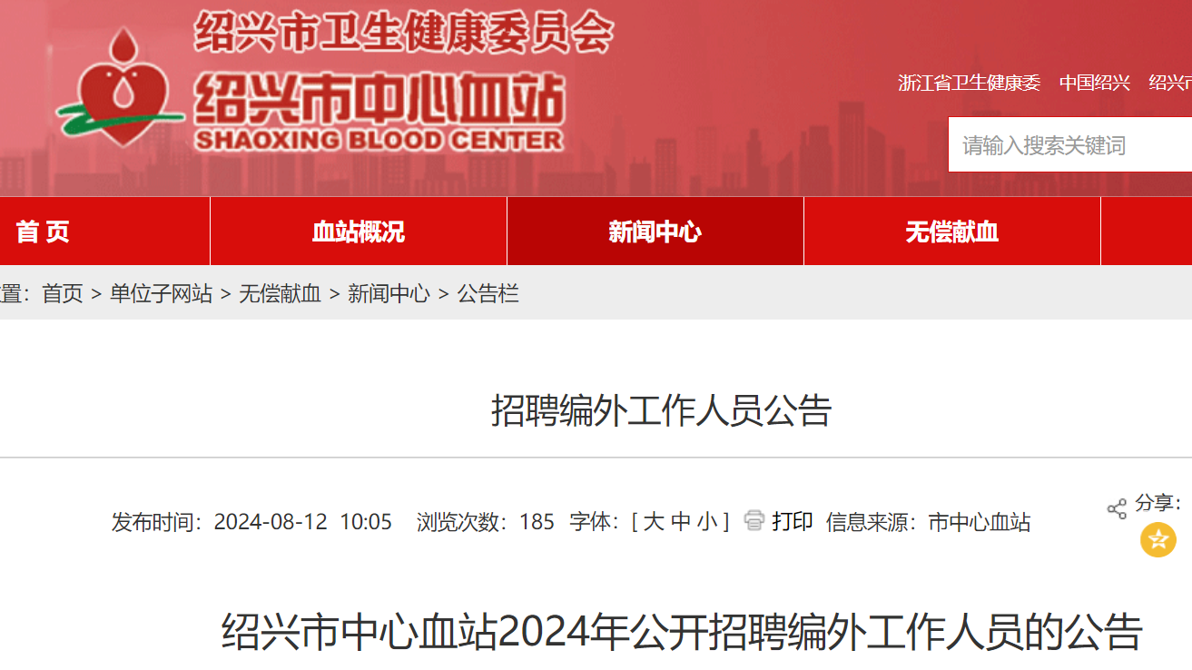 2024年浙江紹興市中心血站公開招聘編外工作人員公告已發(fā)布,報(bào)名時(shí)間:即日起至2024年8月18日?,F(xiàn)將招聘公告原文發(fā)布如下: