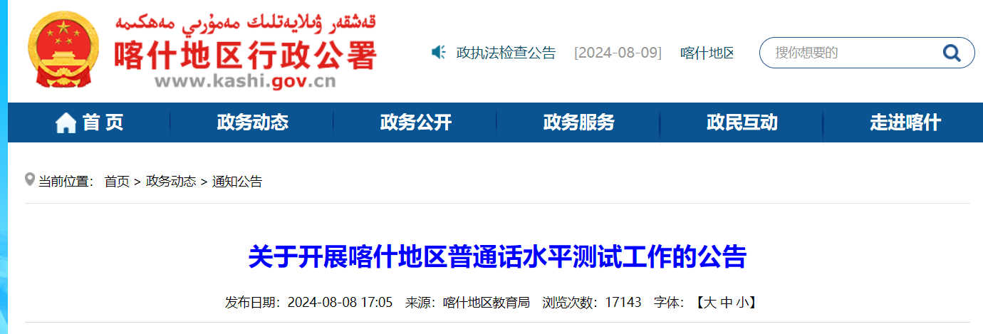 從喀什地區(qū)行政公署獲悉,2024年8月新疆喀什地區(qū)普通話考試時(shí)間及報(bào)名時(shí)間安排(各測(cè)試點(diǎn))已公布,具體詳情如下: