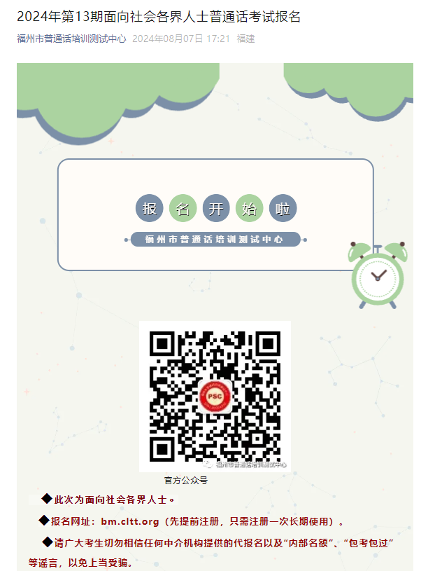 從福州市普通話培訓(xùn)測(cè)試中心獲悉,2024年第13期福建福州普通話報(bào)名時(shí)間為8月10日起,考試時(shí)間為8月24日、25日,具體詳情如下: