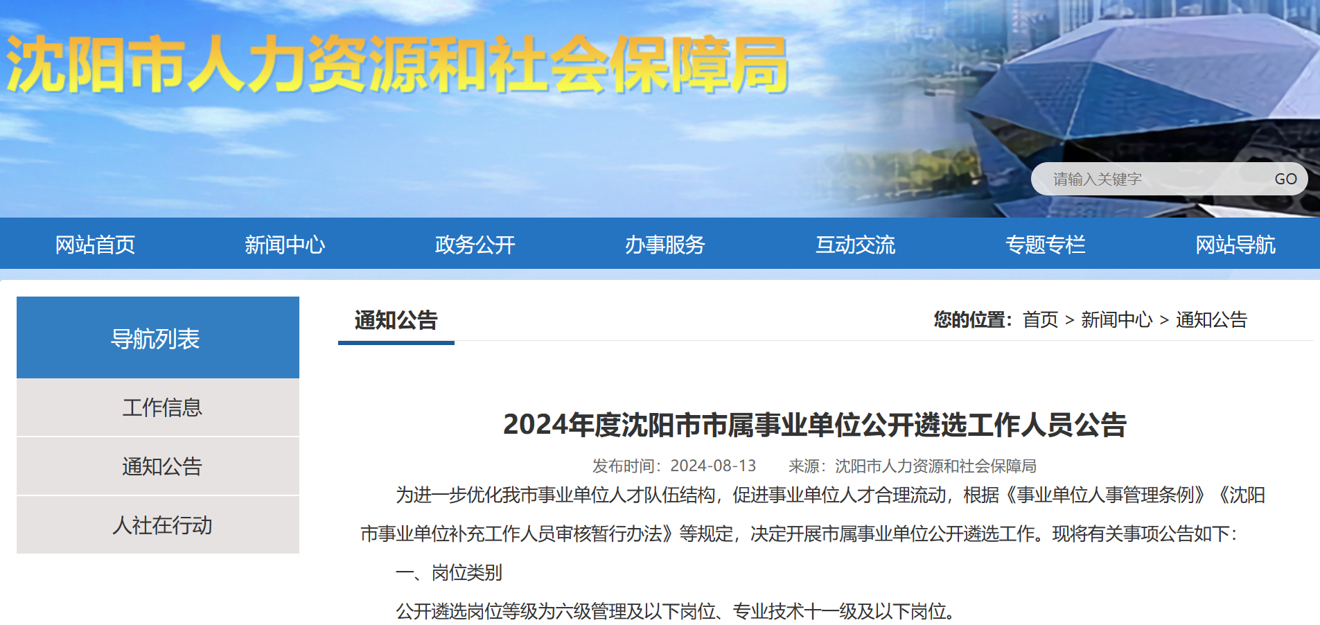 從沈陽市人力資源和社會保障局獲悉,2024年遼寧沈陽市市屬事業(yè)單位遴選工作人員公告已發(fā)布,報名時間為為2024年8月14日至20日,每日9:00至16:00。
