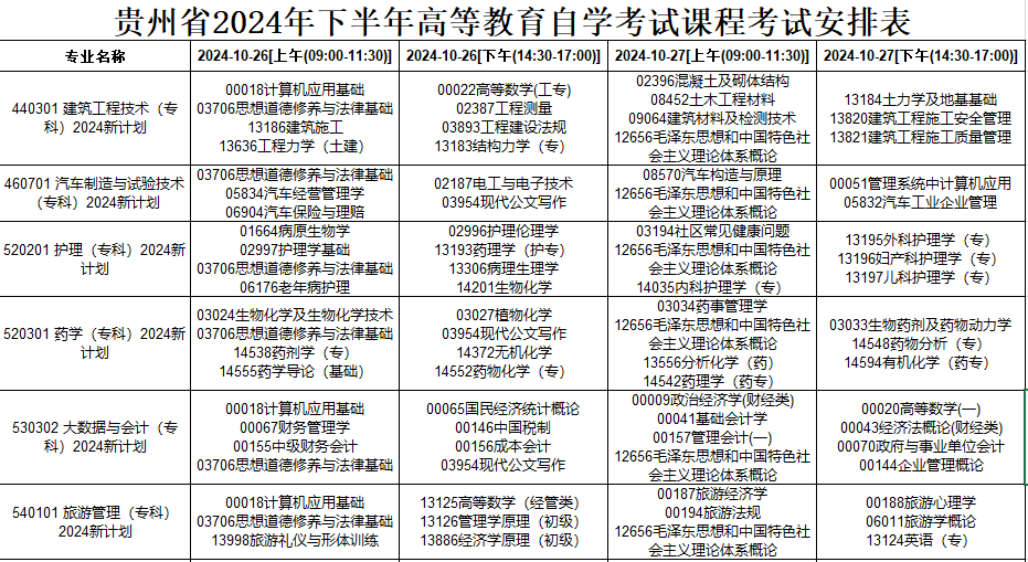 (二)課程考試日程安排詳見《貴州省2024年下半年高等教育自學(xué)考試課程考試安排表》(附件1)。