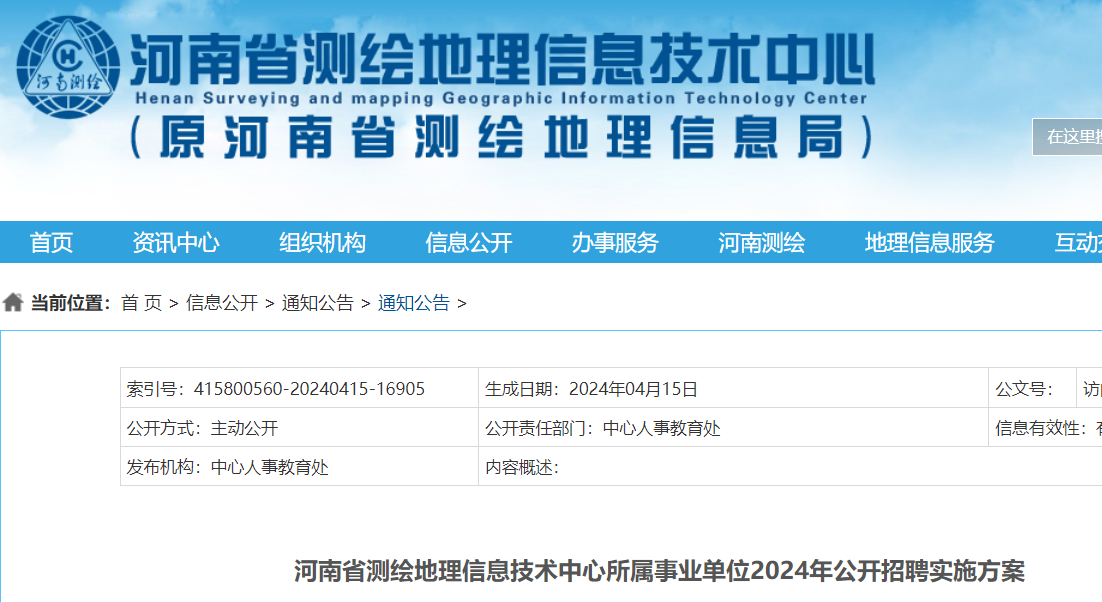 小編根據(jù)河南省測(cè)繪地理信息技術(shù)中心發(fā)布“河南省測(cè)繪地理信息技術(shù)中心所屬事業(yè)單位2024年公開招聘實(shí)施方案”得知,2024年河南省測(cè)繪地理信息技術(shù)中心所屬事業(yè)單位招聘工作人員3名。