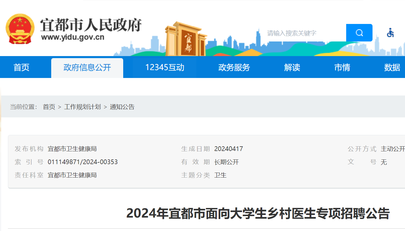 2024年湖北宜昌宜都市面向大學(xué)生鄉(xiāng)村醫(yī)生專(zhuān)項(xiàng)招聘公告已發(fā)布,報(bào)名時(shí)間:2024年4月18日(上午8:30-12:00,下午14:00-17:30)?,F(xiàn)將招聘公告原文發(fā)布如下: