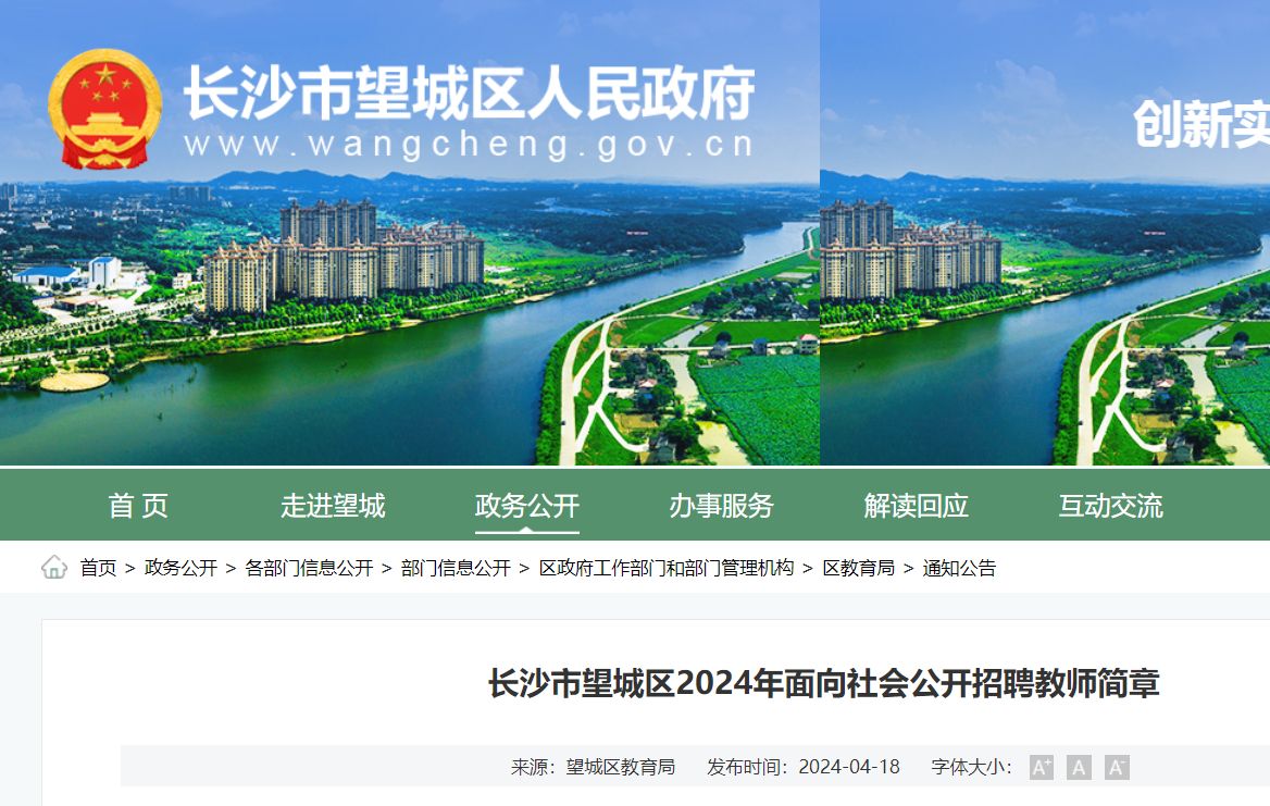 2024年4月18日在望城區(qū)政府門戶網(wǎng)站、“望城教育”微信公眾號上發(fā)布招聘簡章。