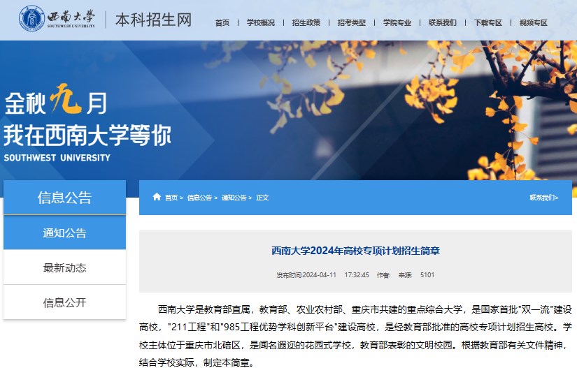 從西南大學(xué)招生就業(yè)處獲悉,2024年西南大學(xué)高校專項(xiàng)計(jì)劃招生簡(jiǎn)章已發(fā)布,報(bào)名時(shí)間截止至4月25日。