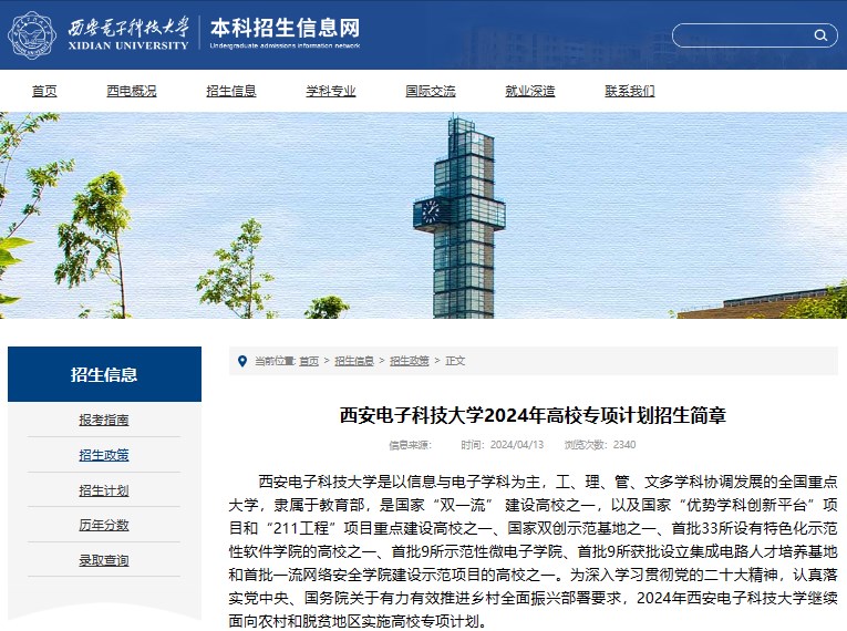 西安電子科技大學(xué)是以信息與電子學(xué)科為主,工、理、管、文多學(xué)科協(xié)調(diào)發(fā)展的全國重點(diǎn)大學(xué),隸屬于教育部,是國家“雙一流” 建設(shè)高校之一,以及國家“優(yōu)勢學(xué)科創(chuàng)新平臺”項(xiàng)目和“211工程”項(xiàng)目重點(diǎn)建設(shè)高校之一、國家雙創(chuàng)示范基地之一、首批33所設(shè)有特色化示范性軟件學(xué)院的高校之一、首批9所示范性微電子學(xué)院、首批9所獲批設(shè)立集成電路人才培養(yǎng)基地和首批一流網(wǎng)絡(luò)安全學(xué)院建設(shè)示范項(xiàng)目的高校之一。為深入學(xué)習(xí)貫徹黨的二十大精神,認(rèn)真落實(shí)黨中央、國務(wù)院關(guān)于有力有效推進(jìn)鄉(xiāng)村全面振興部署要求,2024年西安電子科技大學(xué)繼續(xù)面向農(nóng)村和脫貧地區(qū)實(shí)施高校專項(xiàng)計(jì)劃。