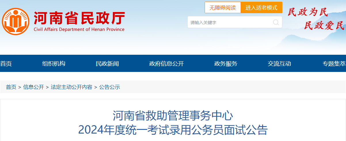 根據(jù)《河南省2024年度統(tǒng)一考試錄用公務(wù)員公告》,現(xiàn)將河南省救助管理事務(wù)中心面試有關(guān)事項(xiàng)公告如下: