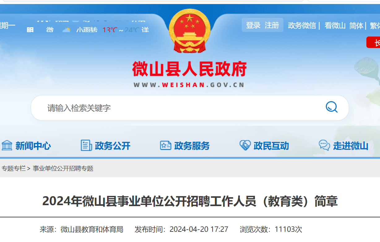 2024年山東濟寧微山縣事業(yè)單位公開招聘工作人員(教育類)簡章已發(fā)布,報名時間:2024年4月25日9:00—4月28日16:00?,F(xiàn)將招聘公告原文發(fā)布如下:
