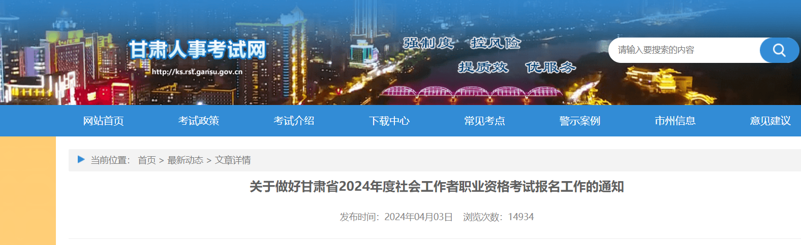 從甘肅人事考試網(wǎng)獲悉,2024年甘肅社會(huì)工作者職業(yè)資格考試報(bào)名工作的通知已公布,4月8日起報(bào)名,具體詳情如下:
