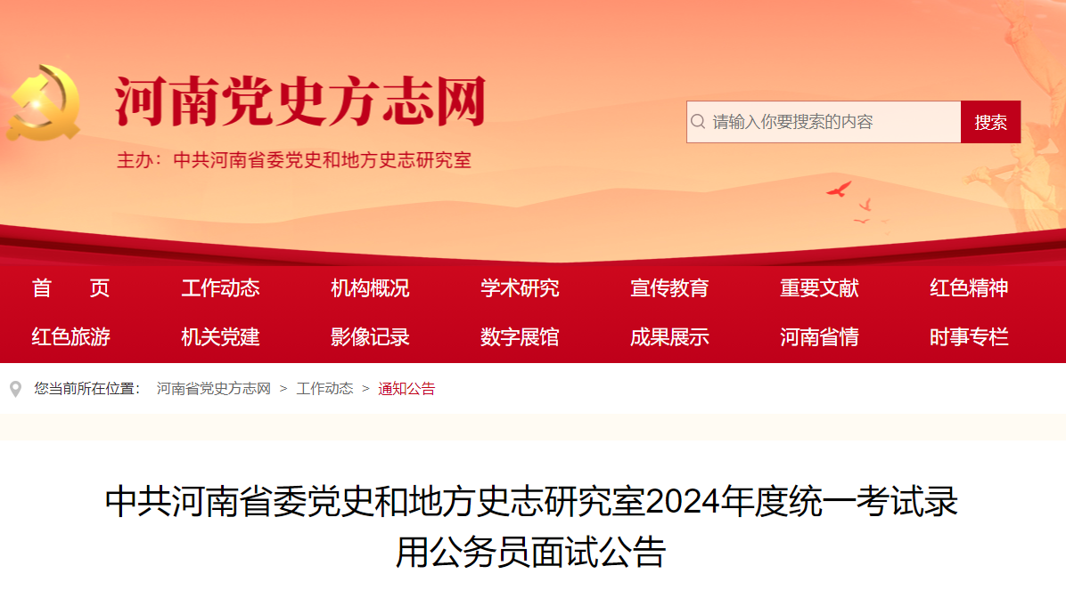 根據(jù)《河南省2024年度統(tǒng)一考試錄用公務員公告》,現(xiàn)將中共河南省委黨史和地方史志研究室面試有關(guān)事項公告如下: