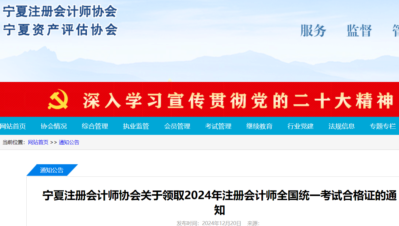 小編根據(jù)寧夏回族自治區(qū)財政廳發(fā)布”寧夏注冊會計師協(xié)會關于領取2024年注冊會計師全國統(tǒng)一考試合格證的通知“得知,2024年寧夏注冊會計師合格證領取時間為2024年12月23日至2025年1月10日,詳情如下: