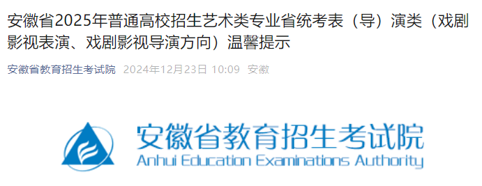 從安徽省教育招生考試院了解到,安徽2025年藝術(shù)類專業(yè)表(導)演類(戲劇影視表演、戲劇影視導演方向)溫馨提示已公布,具體如下: