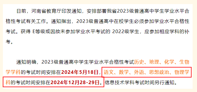 根據(jù)河南省教育廳公布的《河南2023級(jí)普通高中學(xué)生學(xué)業(yè)水平合格性考試時(shí)間》了解到,河南安陽(yáng)2023級(jí)普通高中(高二階段)學(xué)業(yè)水平合格性考試時(shí)間已公布,安排在2024年12月28日-29日。具體如下: