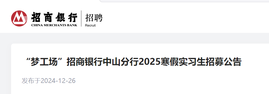 “夢工場”招商銀行廣東中山分行2025寒假實習(xí)生招募公告已發(fā)布,簡歷投遞時間:2025年1月12日23:59截止。現(xiàn)將招聘公告原文發(fā)布如下: