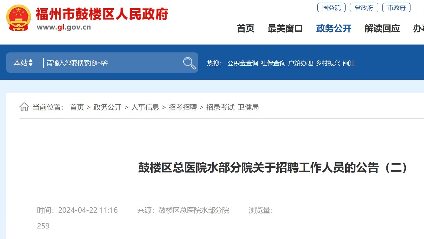 2024福建福州鼓樓區(qū)總醫(yī)院水部分院招聘工作人員2人,招聘截止日期至2024年4月30日。現(xiàn)將招聘公告原文發(fā)布如下: