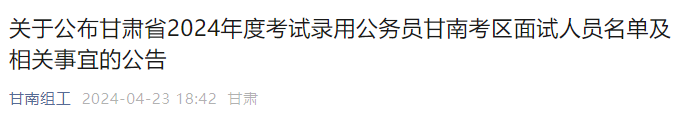 根據(jù)《甘肅省2024年度考試錄用機關公務員和參照公務員法管理單位工作人員公告》有關要求,現(xiàn)將甘南考區(qū)面試相關事宜公告如下:
