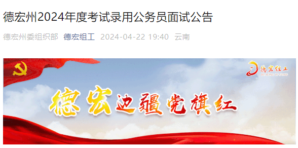 為確保德宏州2024年度考試錄用公務(wù)員面試工作順利完成,根據(jù)云南省公務(wù)員局《云南省2024年度考試錄用公務(wù)員公告》,現(xiàn)將面試工作相關(guān)事宜公告如下: