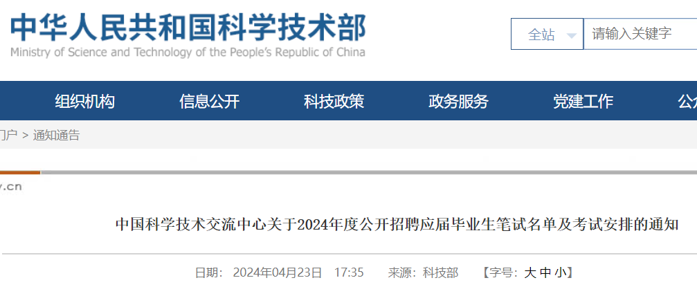 根據(jù)科技部2024年度直屬事業(yè)單位公開招聘應(yīng)屆畢業(yè)生工作統(tǒng)一安排,中國科學(xué)技術(shù)交流中心2024年度公開招聘高校應(yīng)屆畢業(yè)生的筆試定于2024年4月28日進(jìn)行?,F(xiàn)將筆試具體安排通知如下: