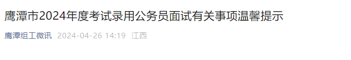 從鷹潭組工微訊了解到,2024年江西鷹潭市考試錄用公務(wù)員面試時(shí)間:4月27日-28日,相關(guān)事宜詳情如下: