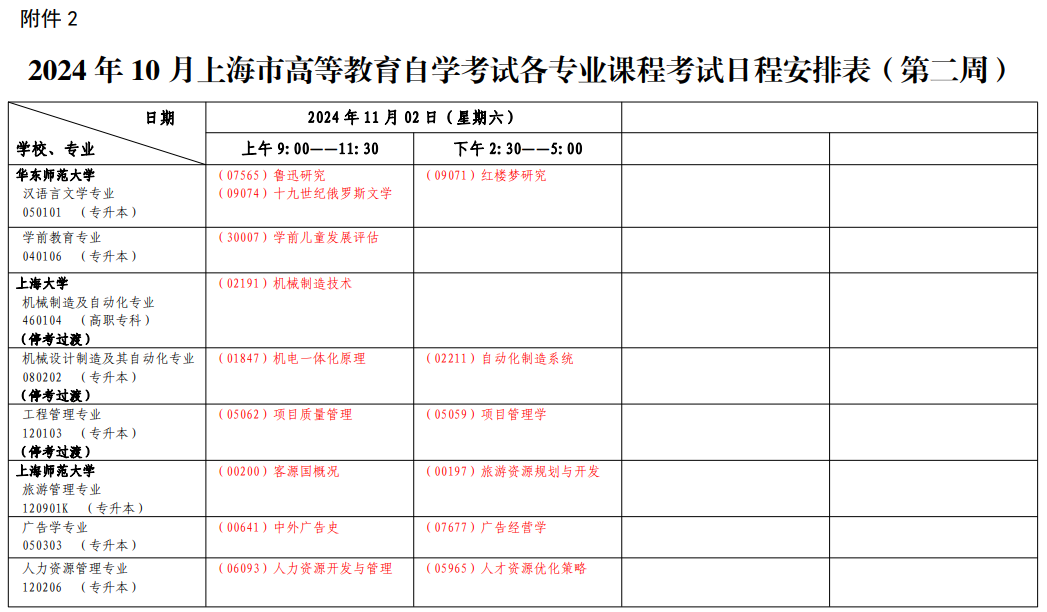2.2024年10月上海市高等教育自學考試各專業(yè)課程考試日程安排表(第二周)