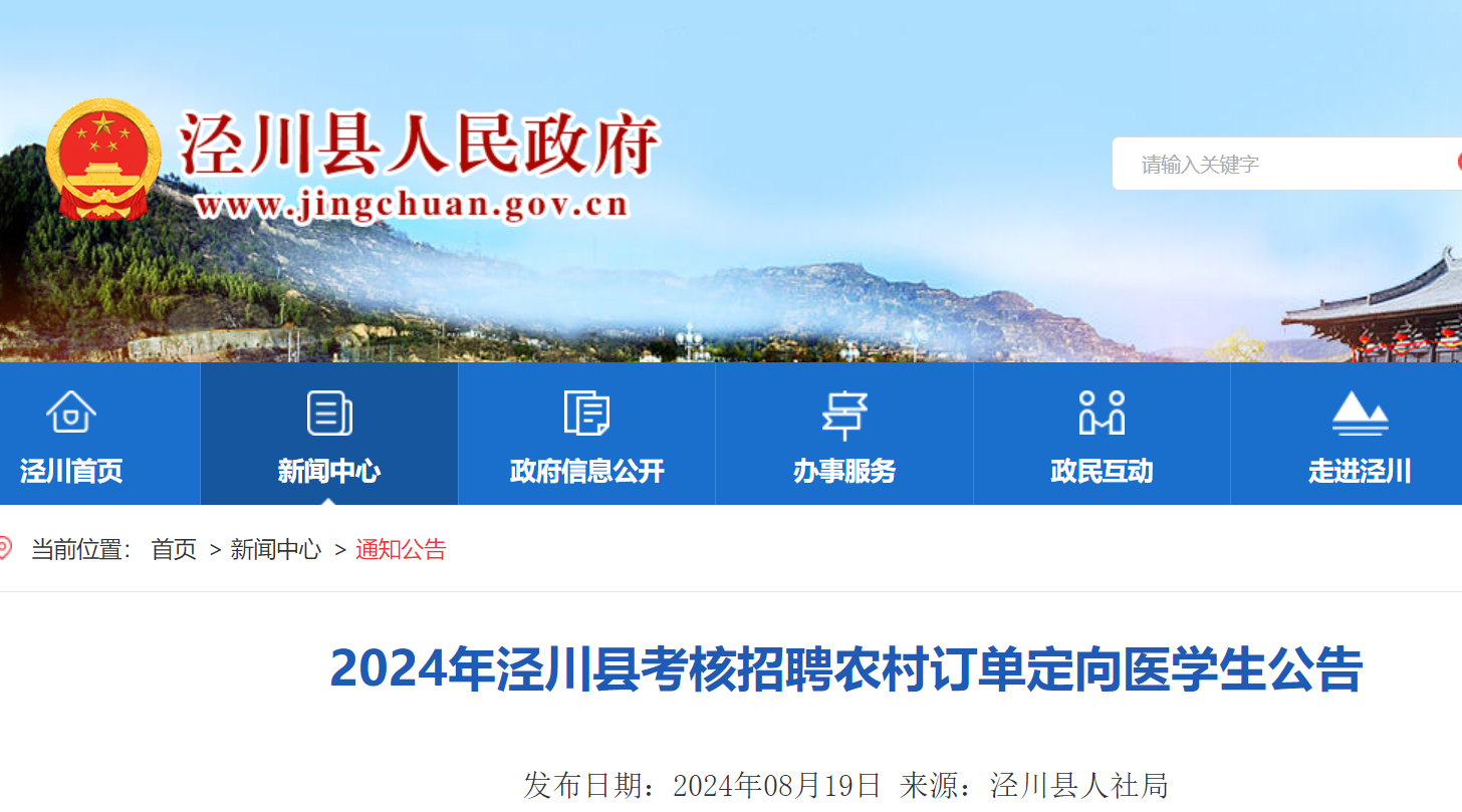 根據(jù)《關(guān)于進(jìn)一步加強(qiáng)農(nóng)村訂單定向醫(yī)學(xué)生免費(fèi)培養(yǎng)就業(yè)安置和履約管理工作的實(shí)施意見(jiàn)的通知》(甘政辦發(fā)〔2020〕68號(hào))、《關(guān)于進(jìn)一步強(qiáng)化農(nóng)村訂單定向醫(yī)學(xué)生就業(yè)安置和履約管理工作的通知》(甘衛(wèi)基層函〔2024〕158號(hào))精神,現(xiàn)將2024年涇川縣考核招聘農(nóng)村訂單定向醫(yī)學(xué)生有關(guān)事宜公告如下。