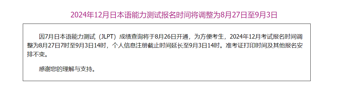 從中國(guó)教育考試網(wǎng)發(fā)布的《2024年12月日本語(yǔ)能力測(cè)試(JLPT)將于8月13日開(kāi)始報(bào)名注冊(cè)》和《2024年12月日本語(yǔ)能力測(cè)試報(bào)名時(shí)間將調(diào)整為8月27日至9月3日》得知,2024年12月內(nèi)蒙古日本語(yǔ)能力測(cè)試報(bào)名時(shí)間、條件及入口已公布,8月27日-9月3日進(jìn)行報(bào)名,具體詳情如下: