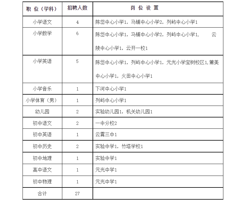 為充實我縣師資力量,改善教師隊伍結(jié)構(gòu),根據(jù)我縣2024年各學段學科教師需求情況,經(jīng)研究,決定面向社會公開招聘中小學幼兒園編外教師27名。具體方案如下:一、招聘職位人數(shù)