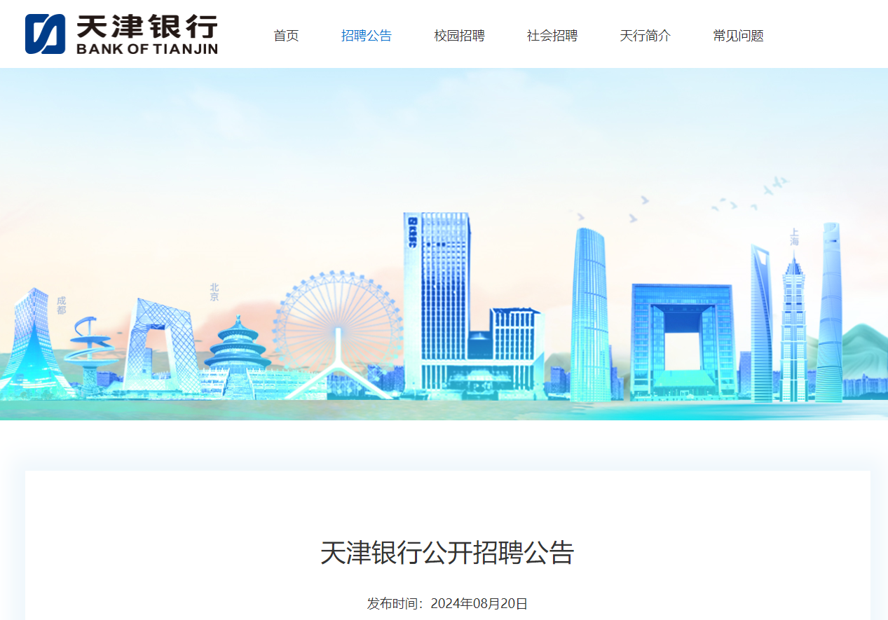 2024天津銀行公開(kāi)招聘公告已發(fā)布,報(bào)名日期:2024年8月20日至2024年9月2日。現(xiàn)將招聘公告原文發(fā)布如下:
