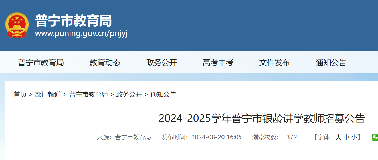 2024-2025廣東揭陽(yáng)市普寧市銀齡講學(xué)教師招募公告已發(fā)布,報(bào)名時(shí)間:2024年8月22-23日(上班時(shí)間)。現(xiàn)將招聘公告原文發(fā)布如下: