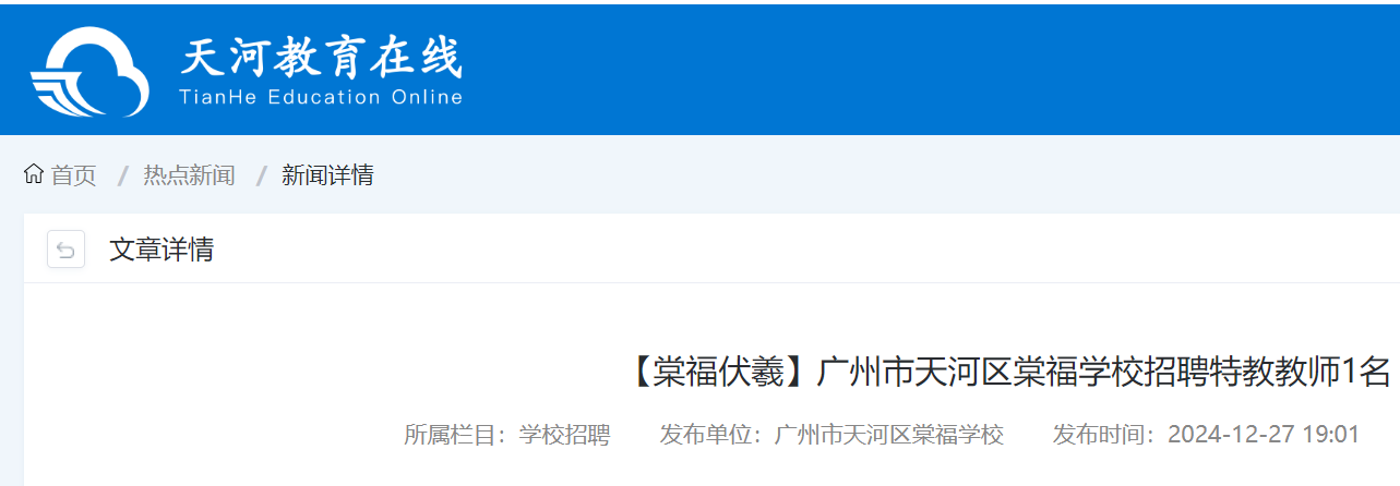 2024年廣東廣州市天河區(qū)棠福學(xué)校招聘特教教師1名,學(xué)校地址:廣州市天河區(qū)棠下棠福路638號?,F(xiàn)將招聘公告原文發(fā)布如下: