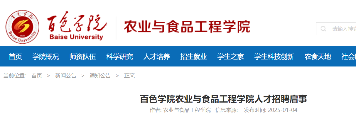 2025年廣西百色學(xué)院農(nóng)業(yè)與食品工程學(xué)院人才招聘啟事已發(fā)布,報名時間:自公告發(fā)布之日起至2025年12月31日?,F(xiàn)將招聘公告原文發(fā)布如下: