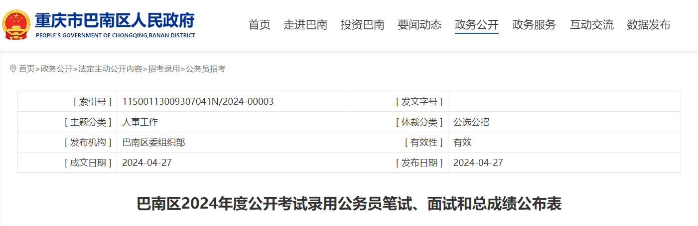巴南區(qū)2024年度公開考試錄用公務(wù)員筆試、面試和總成績(jī)公布表
