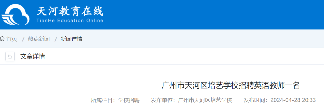 2024廣東廣州市天河區(qū)培藝學(xué)校招聘英語(yǔ)教師1名,工資面議,包吃住,待遇優(yōu)厚?,F(xiàn)將招聘公告原文發(fā)布如下: