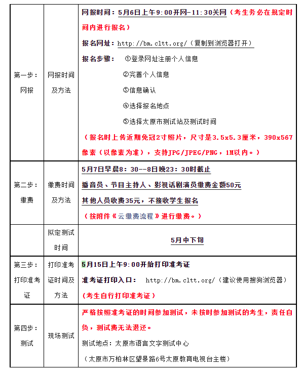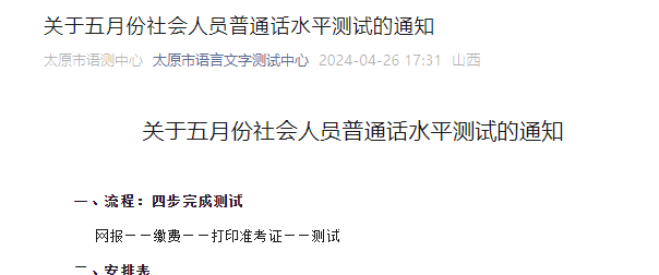 從太原市語言文字測試中心獲悉,2024年5月山西太原普通話水平測試報名時間為5月6日起,準(zhǔn)考證打印5月15日起,具體詳情如下: