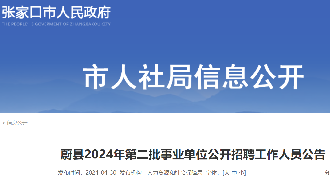 小編根據(jù)張家口市人力資源和社會(huì)保障局發(fā)布“蔚縣2024年第二批事業(yè)單位公開(kāi)招聘工作人員公告”得知,2024河北張家口蔚縣第二批事業(yè)單位招聘工作人員58名,報(bào)名時(shí)間為2024年5月10日至5月16日。